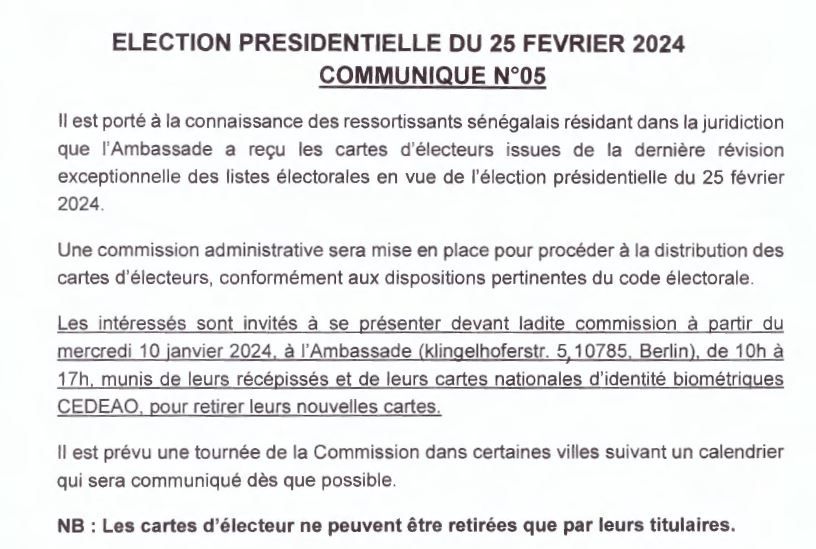 Communiqué relatif à la distribution des cartes d'électeurs auprès de la communauté sénégalaise d'Allemagne, en perspective du scrutin présidentiel.