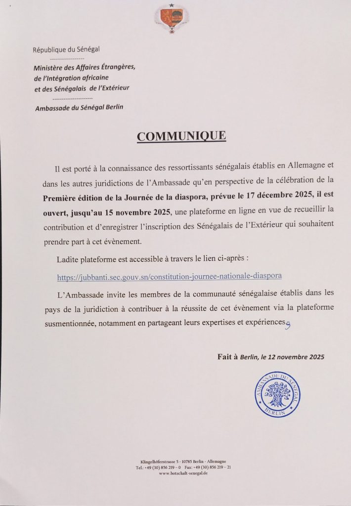 Il est porté à la connaissance des ressortissants sénégalais établis en Allemagne et dans les autres juridictions de l’Ambassade qu’en perspective de la célébration de la Première édition de la Journée de la diaspora, prévue le 17 décembre 2025, il est ouvert, jusqu’au 15 novembre 2025, une plateforme en ligne en vue de recueillir la contribution et d’enregistrer l’inscription des Sénégalais de l’Extérieur qui souhaitent prendre part à cet évènement.